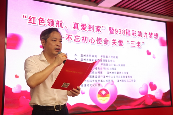 7月7日上午,温州市民政局及温州市福彩中心在素有“浙江延安”、浙南革命根据地之称的平阳县山门镇开展“红色领航、真爱到家”暨“938福彩助力梦想——不忘初心使命关爱三老”公益活动,现场捐助农村困难“三老”人员,并为他们提供志愿服务,在建党99周年之际用实际行动打响温州民政“红色领航,真爱到家”的党建品牌,向社会传递公益正能量。