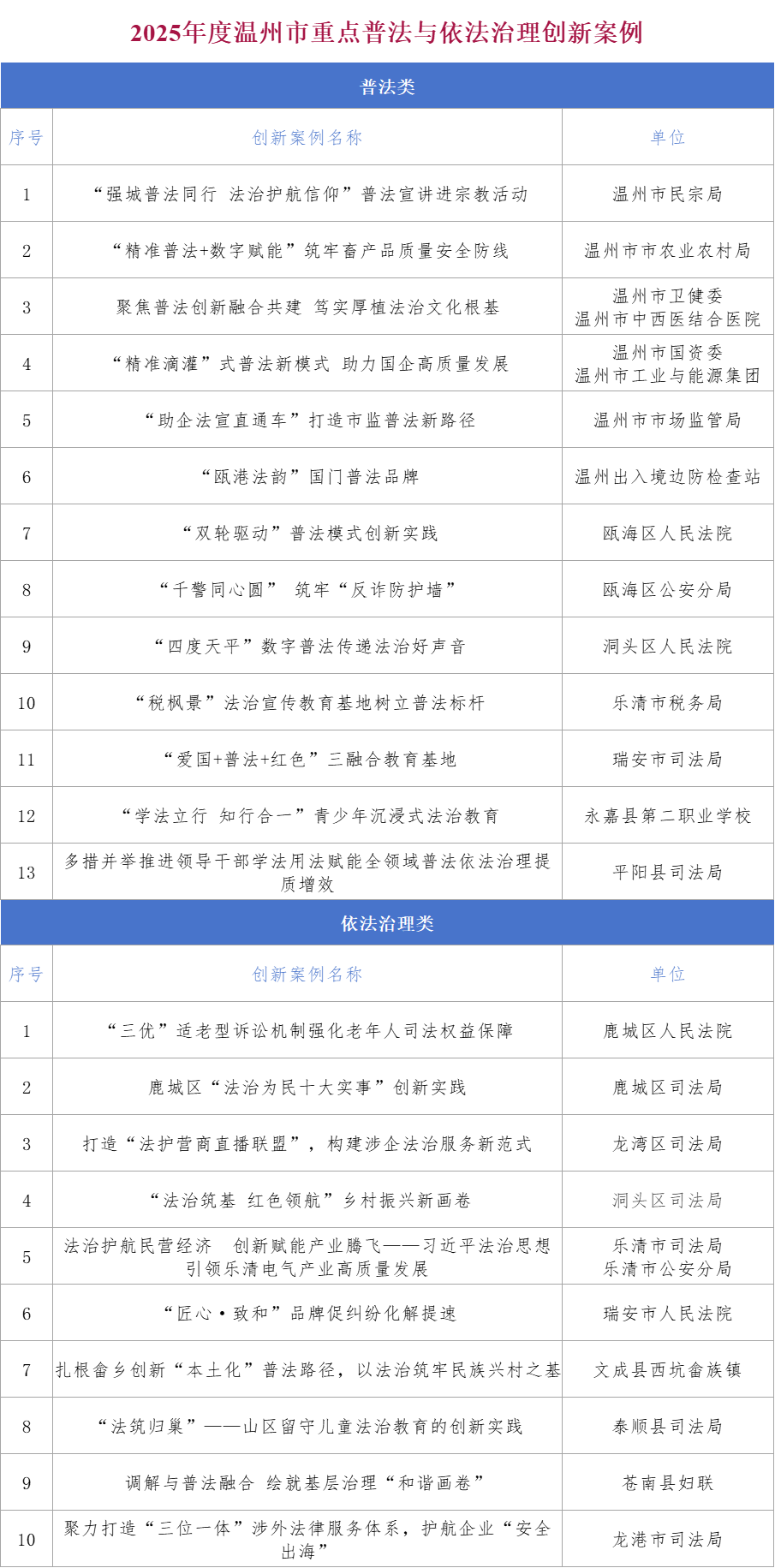 近日,温州市普法办发布2025年度全市重点普法和依法治理创新案例。本次共评选出普法类、依法治理类23项创新案例,内容涵盖民生保障、企业服务、乡村振兴、青少年教育等多个领域,为温州经济社会发展提供坚实法律保障。