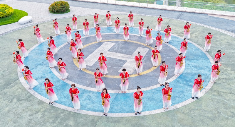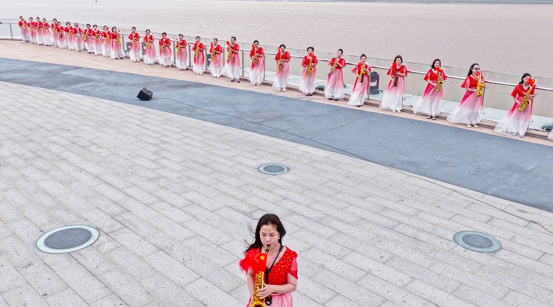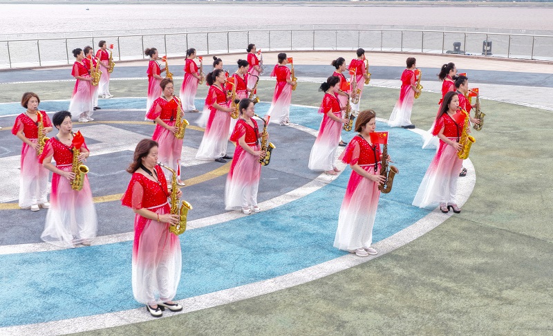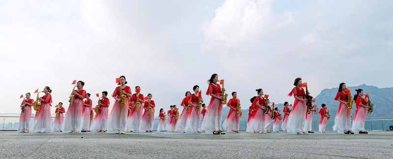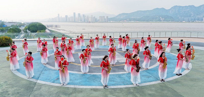 温州市流行音乐协会女子萨克斯专业委员会(筹)于10月8日在温州市鹿城区城市阳台奏响国歌,以音乐献礼国庆。
