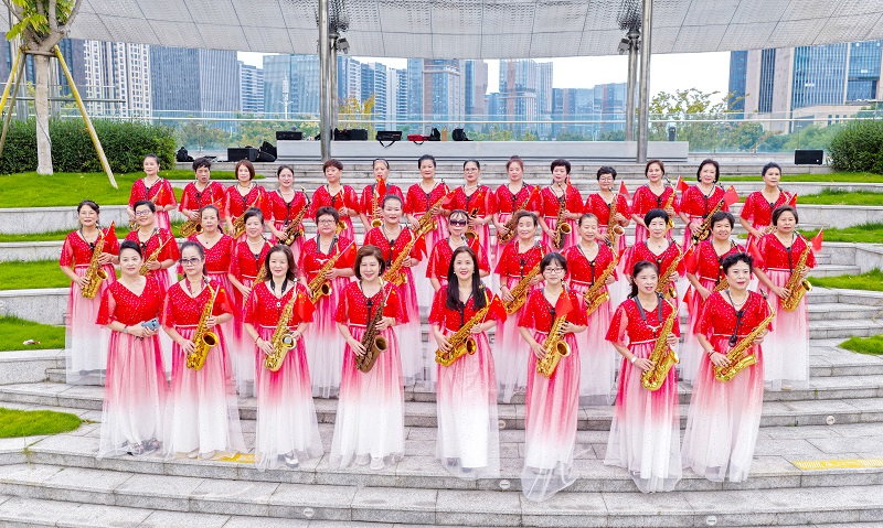 女萨克斯手们身着统一礼服,以精湛技艺演绎国歌